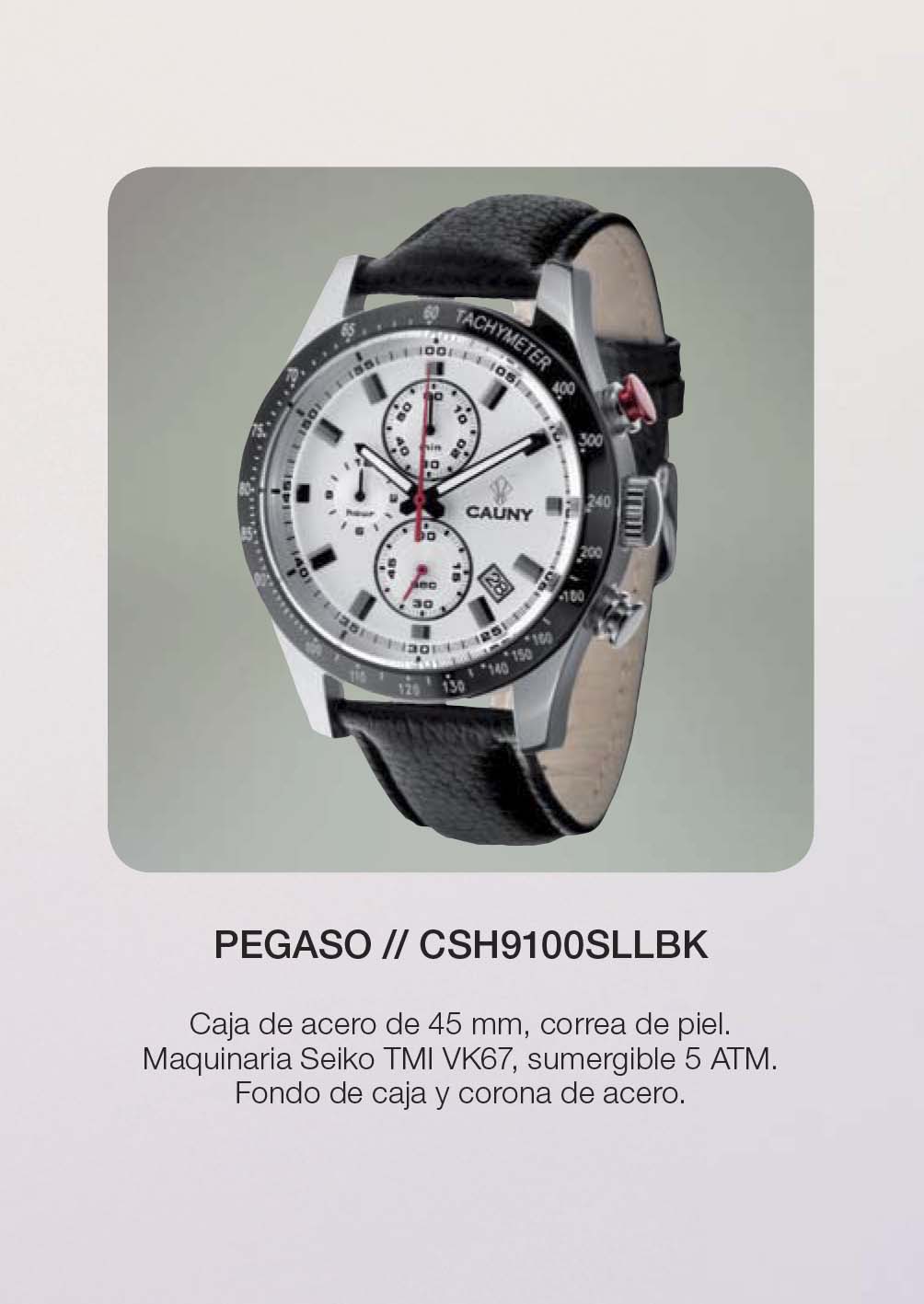 Reloj de Caballero. Caja de Acero de 45 mm. Esfera de color Plata. Maquinaria cronógrafo, modelo Seiko TMI VK67. Correa de Piel en color Negro. 5 ATM Sumergible