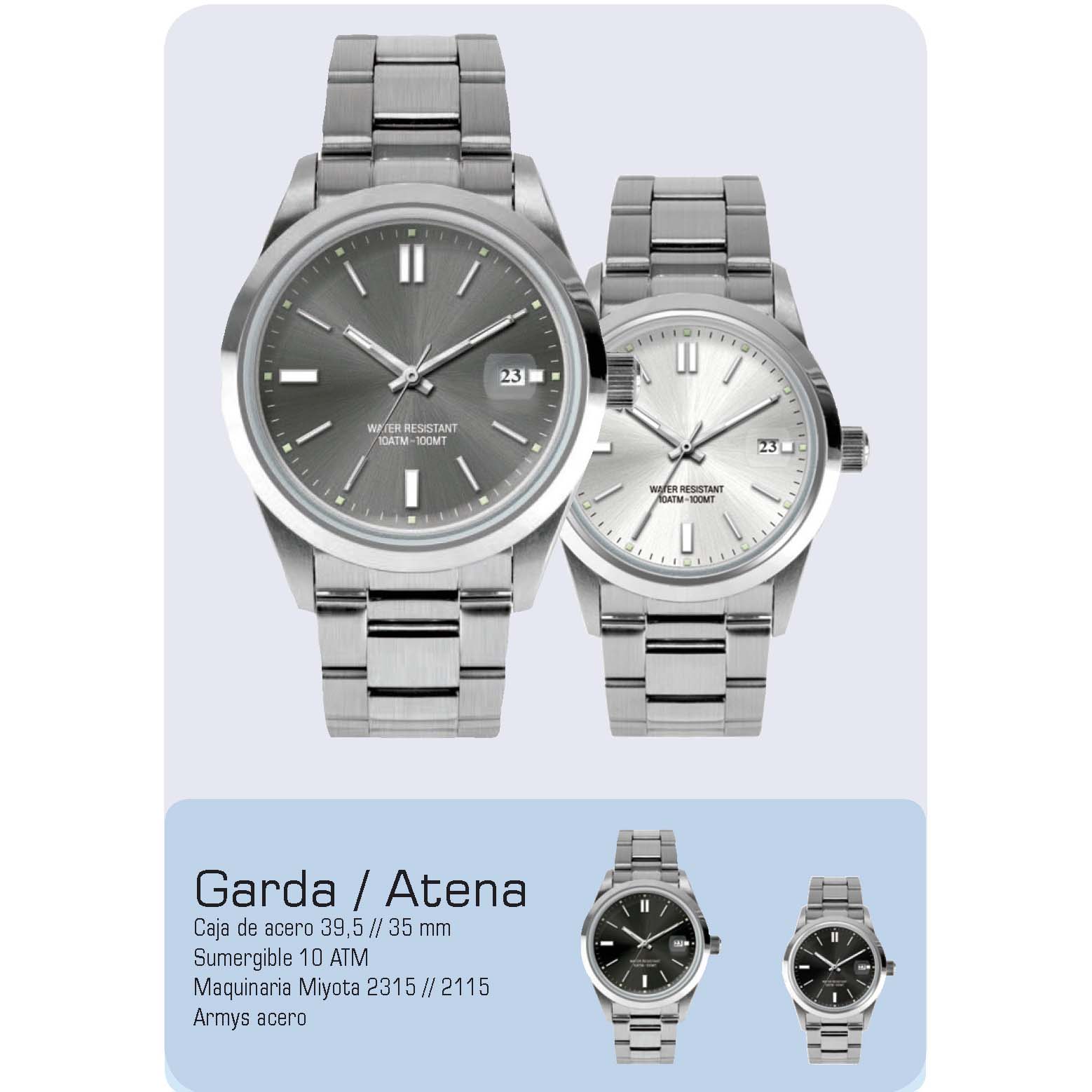 Reloj de Pareja. Caja de Acero de 39,5 // 35 mm. Esfera de color Negro . Maquinaria 3 agujas, modelo Miyota 2315 // 2115. Correa de Acero en color Plata. 10 ATM Sumergible