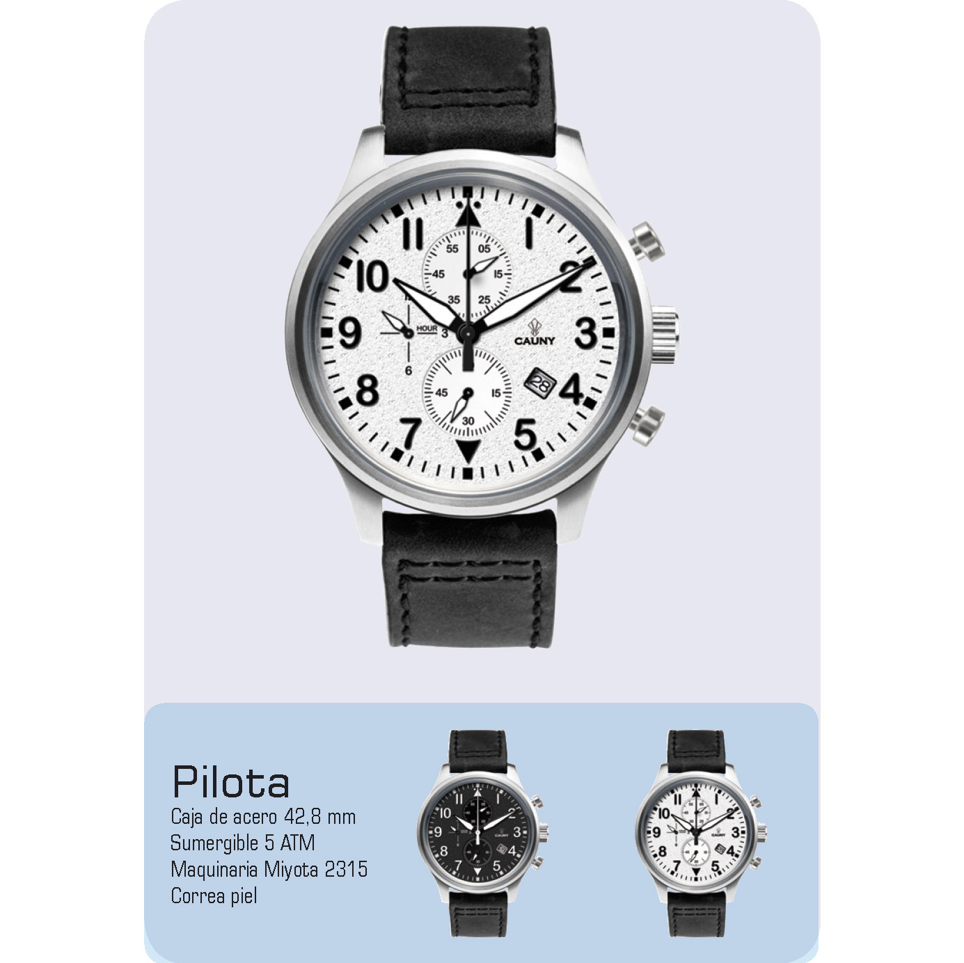 Reloj de Caballero. Caja de Acero de 42,8 mm. Esfera de color Negro . Maquinaria cronógrafo, modelo Miyota OS10. Correa de Piel en color Negro. 5 ATM Sumergible