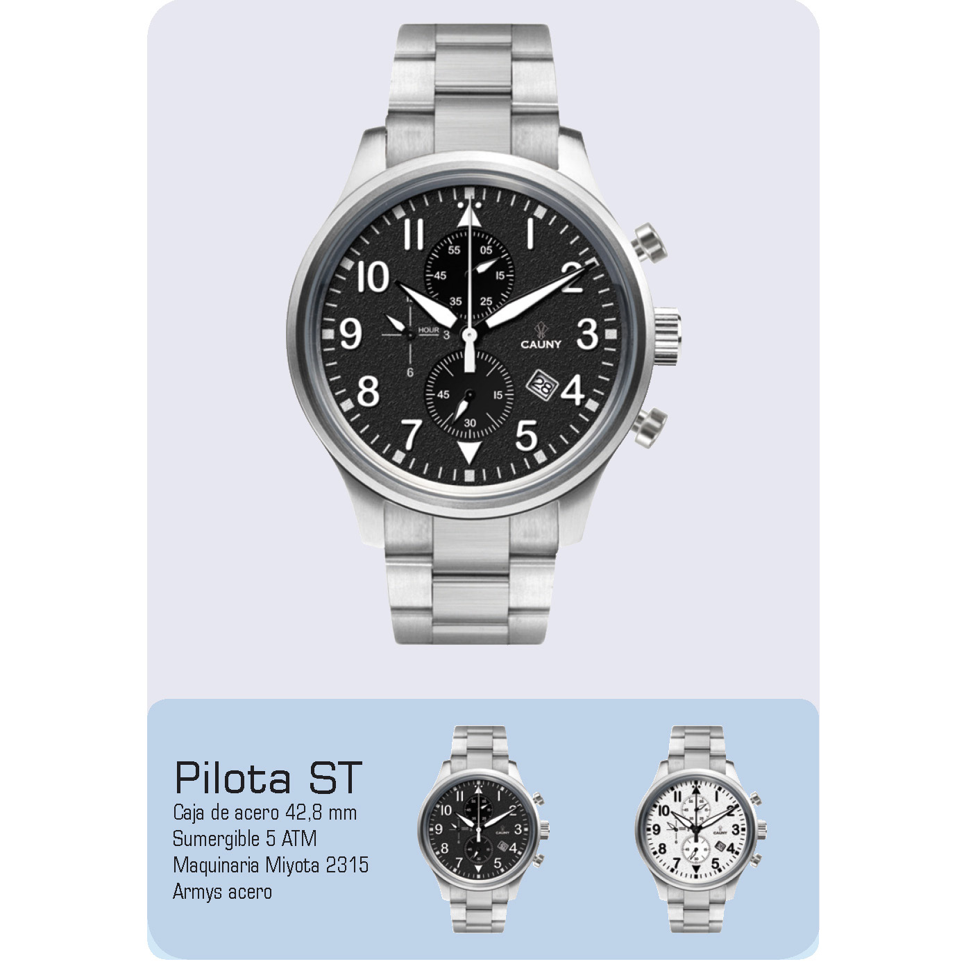 Reloj de Caballero. Caja de Acero de 42,8 mm. Esfera de color Blanco . Maquinaria cronógrafo, modelo Miyota OS10. Correa de Acero en color Plata. 5 ATM Sumergible