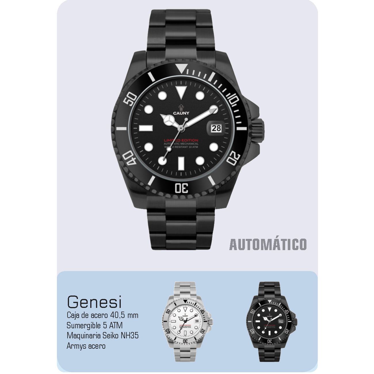 Reloj de Caballero. Caja de Acero de 40,3 mm. Esfera de color Negro . Maquinaria 3 agujas automática, modelo Seiko NH35. Correa de Acero en color Negro. 5 ATM Sumergible