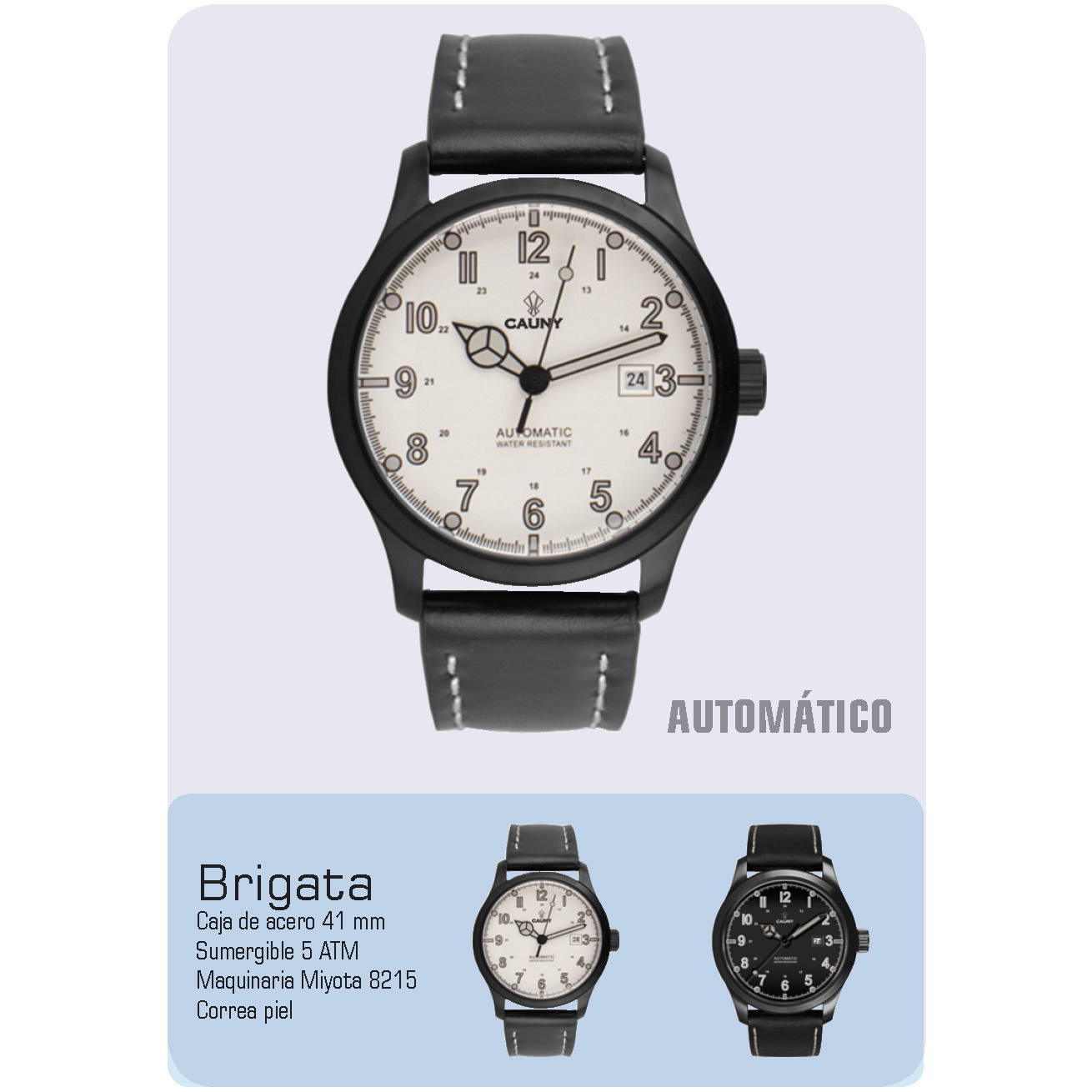 Reloj de Caballero. Caja de Acero de 41 mm. Esfera de color Blanco . Maquinaria 3 agujas automática, modelo Miyota 8215. Correa de Piel en color Negro. 5 ATM Sumergible