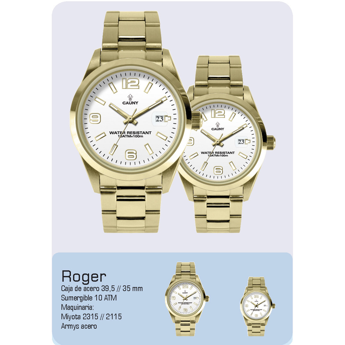 Reloj de Pareja. Caja de Acero de 39,5 // 35 mm. Esfera de color Blanco . Maquinaria 3 agujas, modelo Miyota 2315 // 2115. Correa de Acero en color Dorado. 10 ATM Sumergible