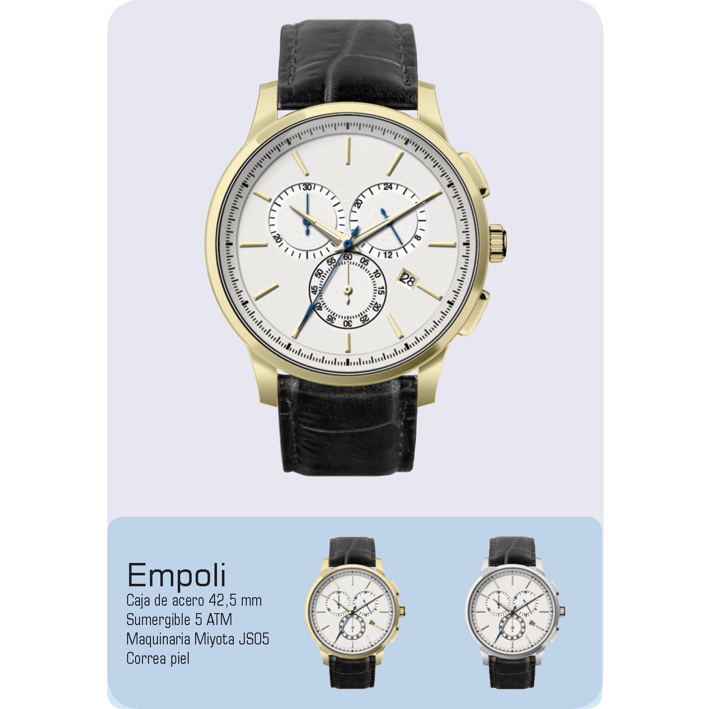 Reloj de Caballero. Caja de Acero de 42,5 mm. Esfera de color Plata . Maquinaria cronógrafo, modelo Miyota JS05. Correa de Piel en color Marrón. 5 ATM Sumergible