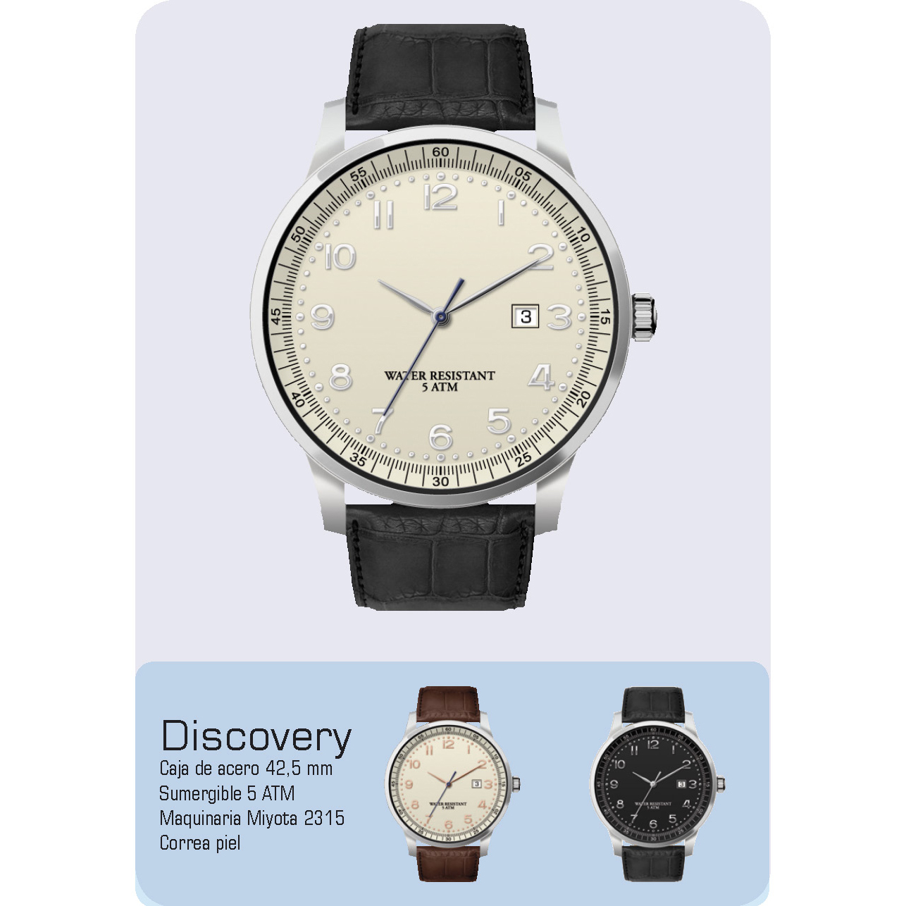 Reloj de Caballero. Caja de Acero de 42,5 mm. Esfera de color Negro . Maquinaria 3 agujas, modelo Miyota 2315. Correa de Piel en color Negro. 5 ATM Sumergible