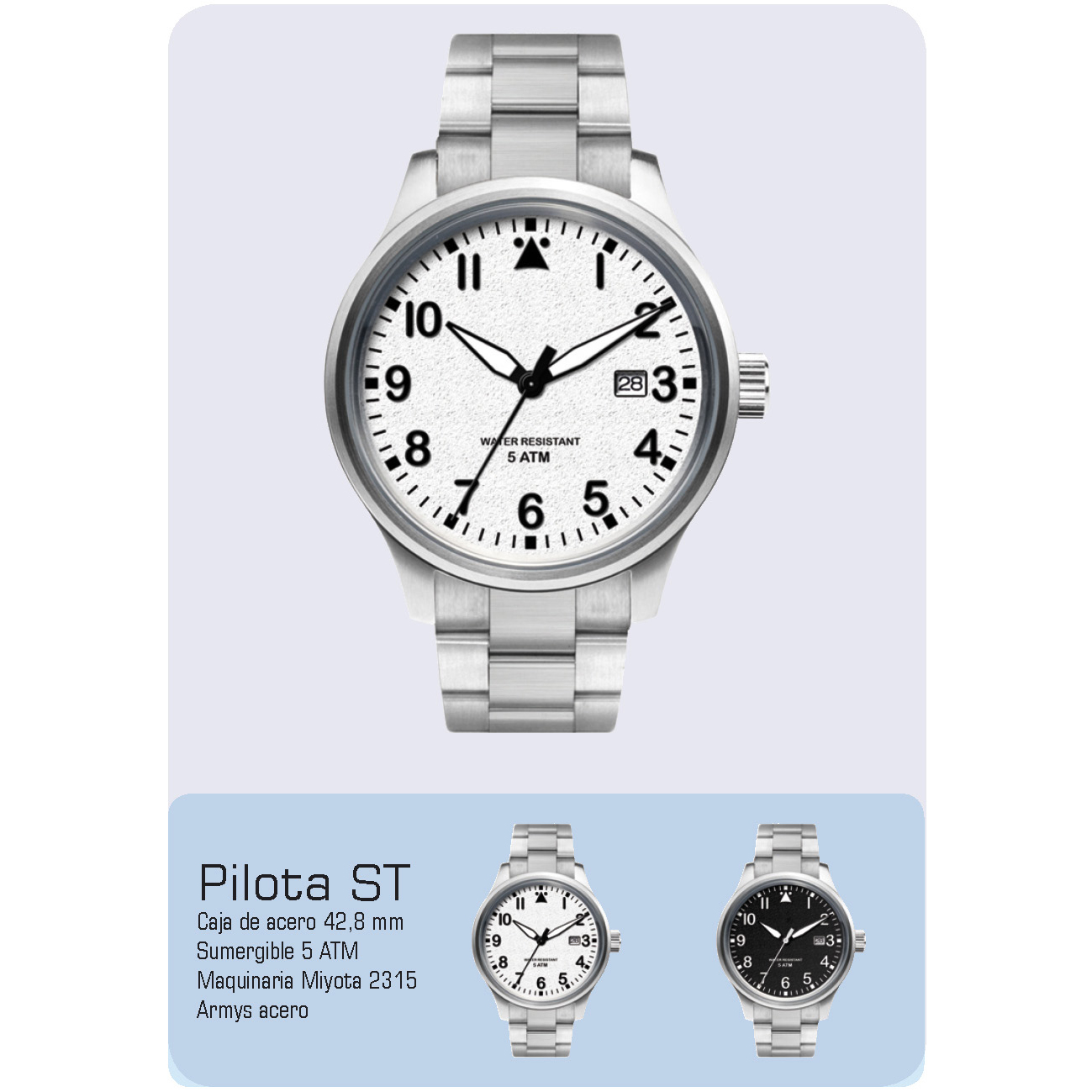 Reloj de Caballero. Caja de Acero de 42,8 mm. Esfera de color Negro . Maquinaria 3 agujas, modelo Miyota 2315. Correa de Acero en color Plata. 5 ATM Sumergible