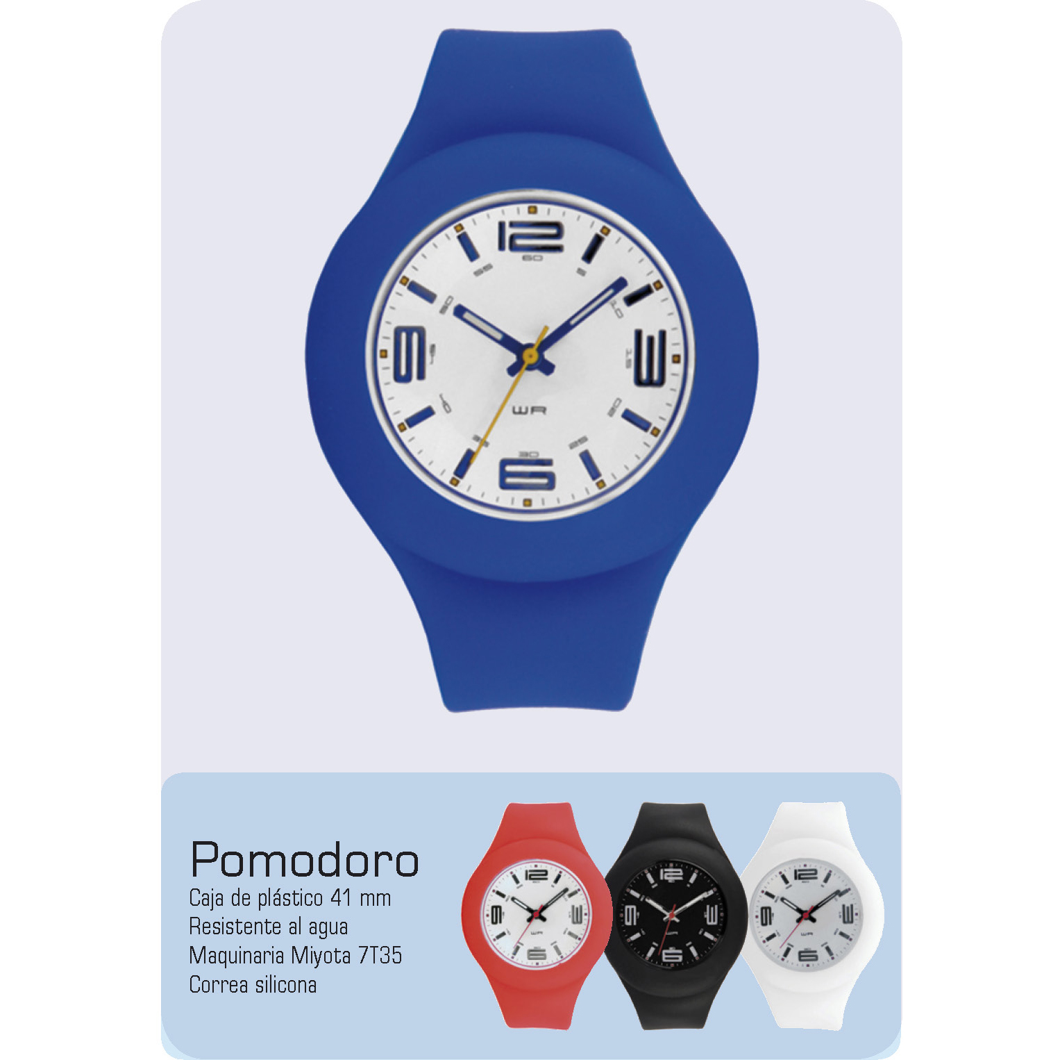 Reloj de Unisex. Caja de Plástico de 41 mm. Esfera de color Blanco . Maquinaria 3 agujas, modelo Miyota 7T35. Correa de Silicona en color Rojo. Resistente No Sumergible