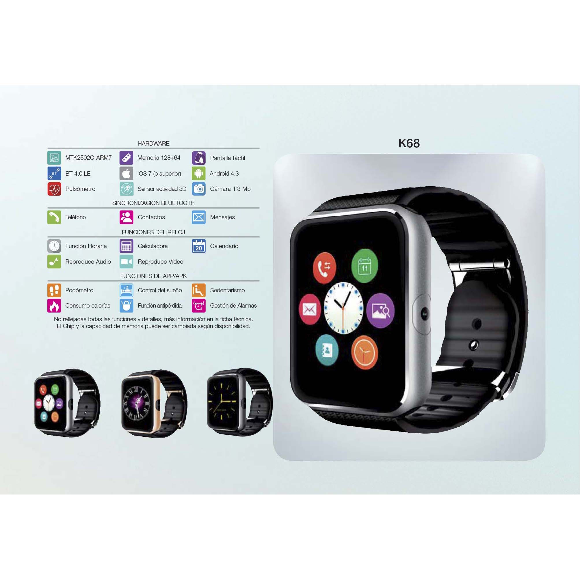 | Funciones App / Apk | Podómetro, Control del sueño, Control sedentarismo, Consumo de calorías, Función antipérdida, Gestión de alarmas |