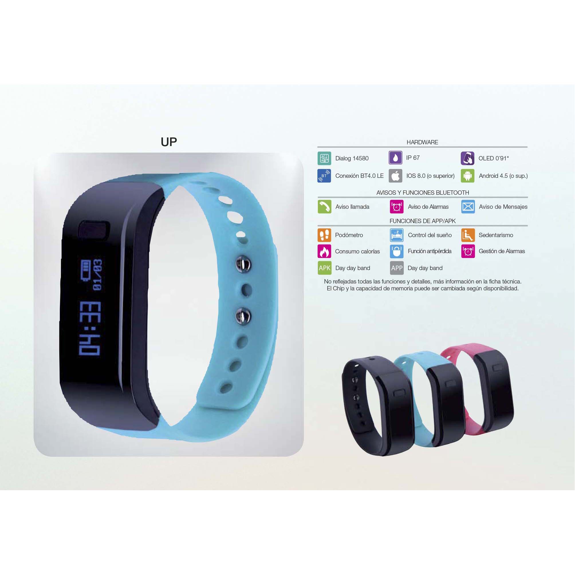 | Funciones App / Apk | Podómetro, Control del sueño, Control sedentarismo, Consumo de calorías, Función antipérdida, Gestión de alarmas |