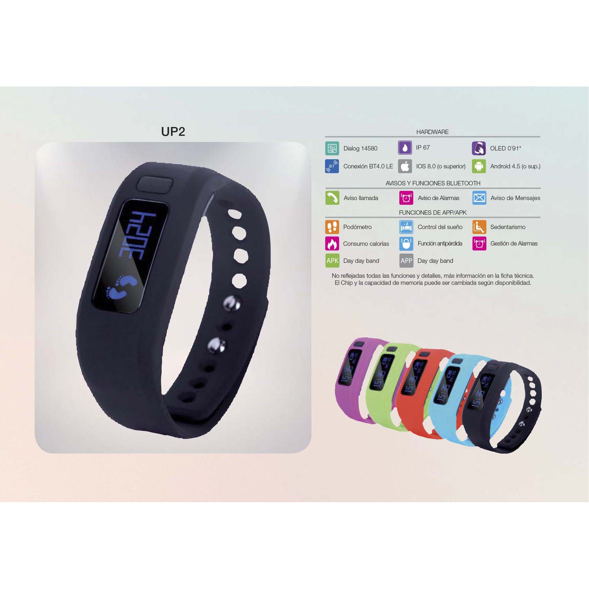 | Funciones App / Apk | Podómetro, Control del sueño, Control sedentarismo, Consumo de calorías, Función antipérdida, Gestión de alarmas |